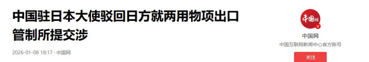 【1】2026年1月8日发布 官方媒体 中国网《中国驻日本大使驳回日方就两用物项出口管制所提交涉》
